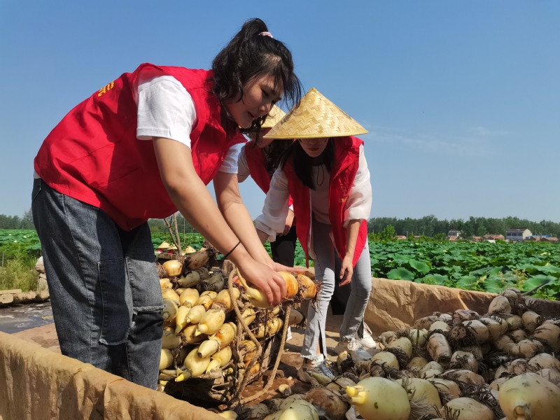 淮阴区三树镇四门闸村的特色产业项目是藕虾套养,眼下正好是莲藕收获的季节,本次党日活动的重点是协助居民们采挖莲藕,同时将采挖上的莲藕进行清洗、分拣、装车。在劳动现场,大家分工明确、团结协作。不怕脏、不怕累,干劲十足,呈现出一片热火朝天的劳动景象。预备党员积极带头,穿上防水服主动下到滩地里帮助拉运采收的莲藕。团员青年们也不甘示弱,在滩地里清洗、整理莲藕。最后大家齐心协力把整理好的莲藕帮助师傅们一筐一筐地抬上卡车摆放好,不知不觉采购莲藕的卡车已经装满了一大半。虽然很劳累,看着自己挖上来的这堆积如山的莲藕,每个人的脸上都绽开灿烂的笑容,深刻的体会到了劳动的快乐。