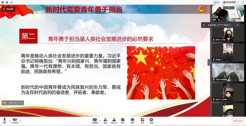 本次公开课分为学习团史知识、传承红色精神、青年需担当、做优秀共青团员和分享心得体会五个环节,w88win体育官网入口20级、21级团支书参加了此次线上公开课。活动在一段展现共青团百年历史的视频资料中拉开帷幕,同学们聚精会神的凝听着,从中汲取奋进的青春力量。接下来,组织部杨盼同学带领大家重温了五四精神和共青团十八届六中全会会议内容,并号召大家做有理想、不保守、敢担当、肯付出的优秀共青团员,充分融入时代大潮中承担国家与民族大任,绽放青春光芒,实现更大的价值。最后,在分享心得体会环节,同学们纷纷表示,作为共青团员应该深刻领会“两个确立”的决定性意义,不断增强“四个意识”、坚定“四个自信”、做到“两个维护”,不断增强责任感、使命感、紧迫感。