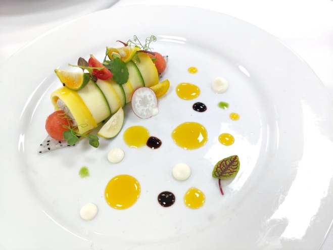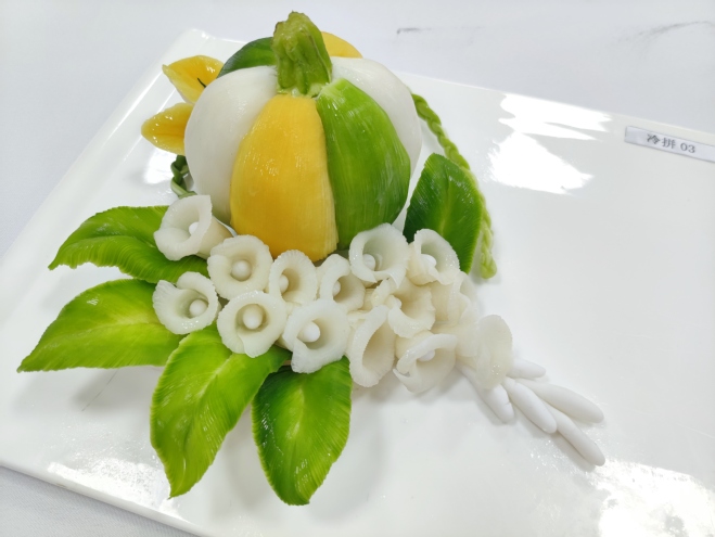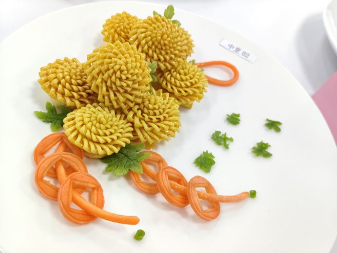 大赛活动严格遵循烹饪竞赛规则,赛前通过抽签确定参赛序号。大赛要求参赛者所作菜肴或点心需将中国二十四节气元素融入到菜点创新设计与制作中。元素包括但不限于节令食材的选用、节气养生理念的融入(营养、保健、药膳)、二十四节气文化内涵的体现及二十四节气相关的造型等。通过参赛员工现场规范的着装、娴熟的操作、卫生的把控以及精心制作的菜品,反映出学子独具匠心的创意与优良的职业素养,能巧妙地将传统二十四节气文化与现代烹饪技术融合运用,对厨艺的热爱溢于言表。