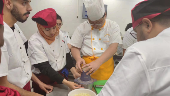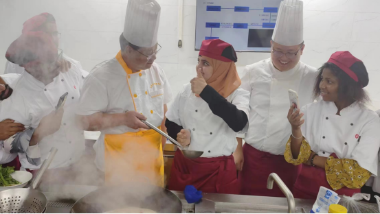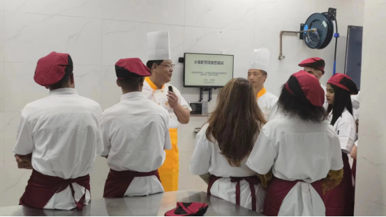 张胜来教授作为国家人社部首批专项能力“盱眙龙虾制作”考核标准的制定者,为职工介绍了淮安特色食材——小龙虾,从小龙虾的养殖、捕捞、挑选、烹制等几个方面进行了阐述,让国际职工深入了解小龙虾的初加工技术、不同口味龙虾的烹制技艺以及龙虾食用安全措施等内容。