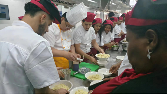 理论授课结束后进行了实际操作部分,张教授为大家示范了蒜泥龙虾、十三香龙虾两款中国市场上比较受欢迎的龙虾制作方法,并一步步教授我们职工,现场职工的参与度也比较高,很多的同学参与到龙虾制作的每一步,为最后员工制作小龙虾提供了技术支撑。