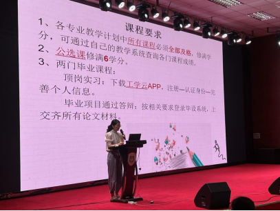 教务秘书杨希介绍了实习期间公司产品工作安排,主要从毕业生课程要求、证书要求、教务系统学分查询、下学期工作安排、毕业审核前工作等方面展开了宣讲。