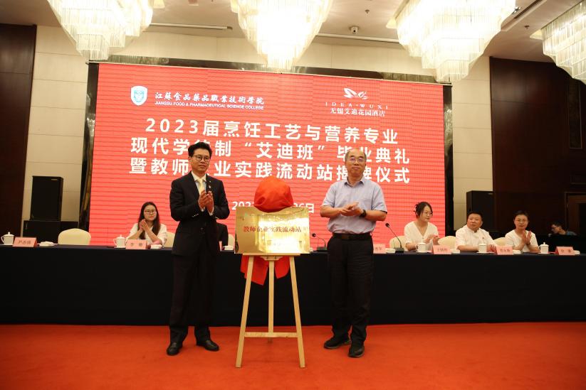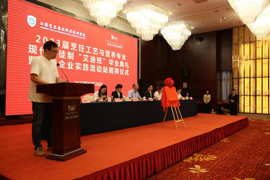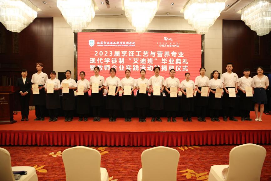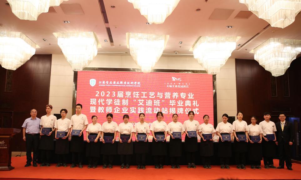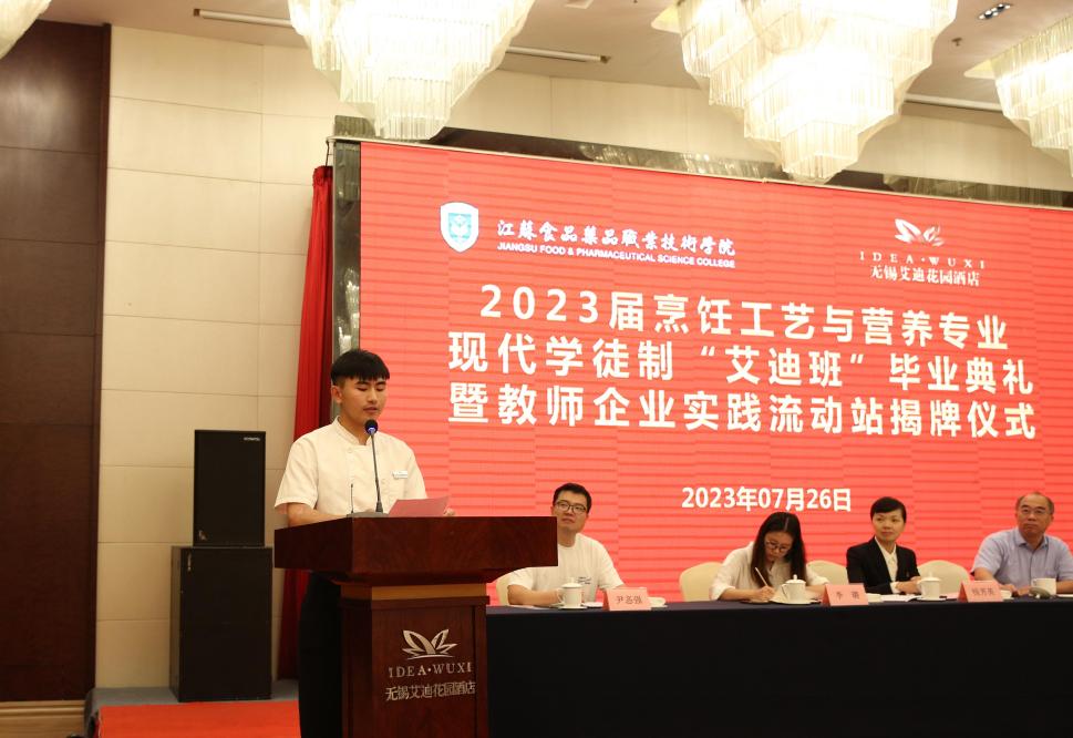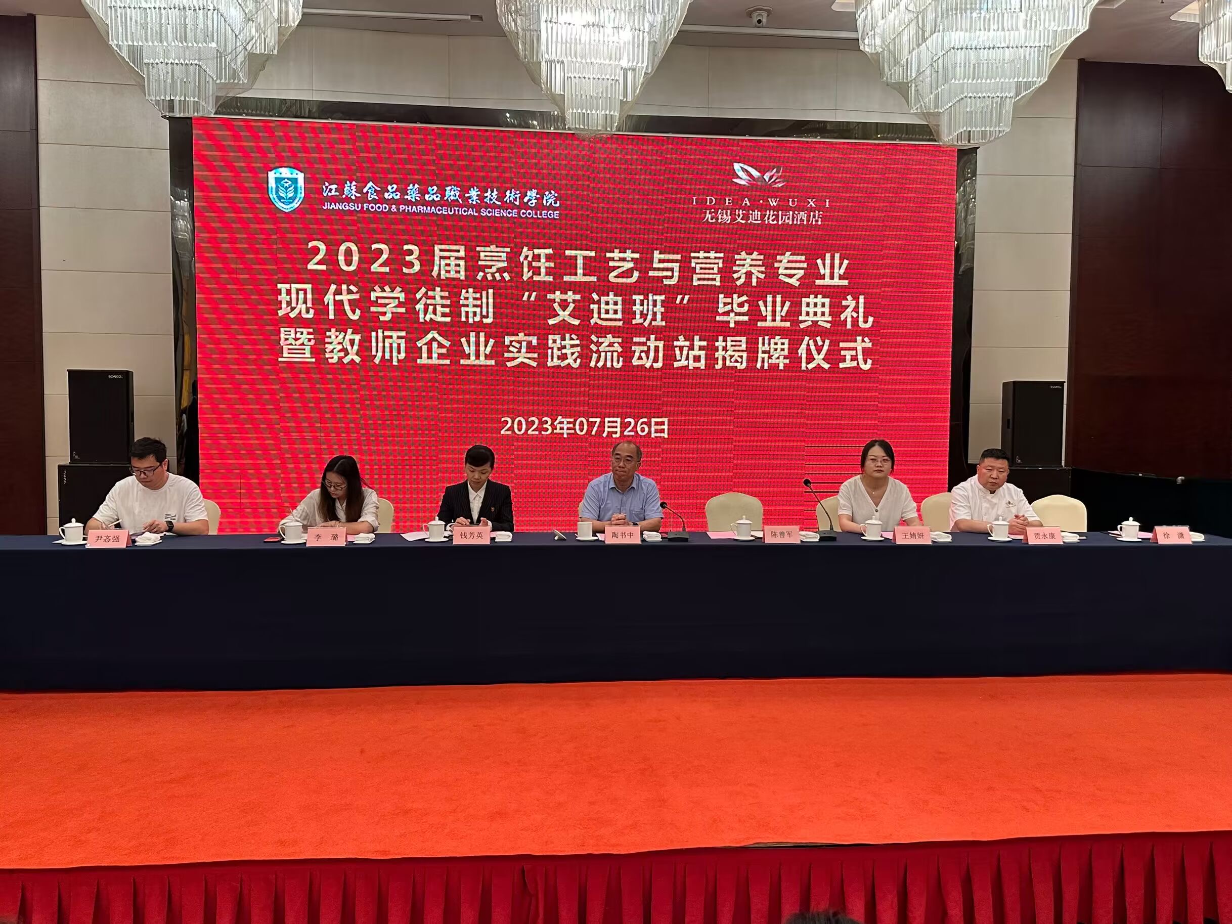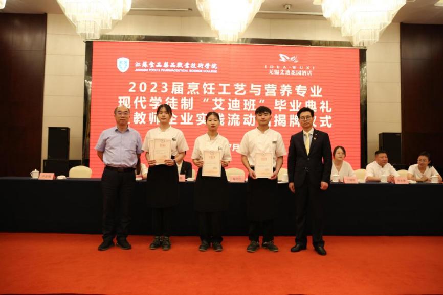 726上午,w88win体育官网入口在无锡艾迪花园酒店惠山厅举办2023届烹饪工艺与营养专业现代学徒制“艾迪班”毕业典礼暨教师企业实践流动站揭牌仪式,江苏食品药品职业技术公司党委书记陶书中,国际与港澳台合作交流处处长王婧妍,w88win体育官网入口副经理尹忞强,艾迪班班主任徐潇及w88win体育官网入口综合科李璐,无锡艾迪花园酒店总经理陈善军,执行总经理钱芳英,行政总厨贾永康参与了毕业典礼暨揭牌仪式。参加本次仪式还有2020级烹饪工艺与营养专业现代学徒制“艾迪班”毕业生15人,2021级实习生10人,2022级实习生20人。