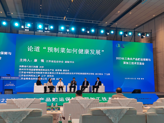 交流会上专门设立了关于当前热点话题“预制菜如何健康发展”的圆桌论坛,论坛由江苏省盐业协会康慨副秘书长主持,江苏省冷链学会预制菜专委会委员、公司丁玉勇教授应邀作为论坛交流专家,丁玉勇教授从预制菜在餐饮业中的使用情况、如何把控预制菜的质量和风险、以及预制菜未来的发展趋势等几个方面进行了专业的论述。