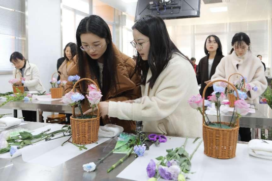 本次“三八女神节”花艺制作活动由酒店管理与数字化运营专业团队承办,张丽老师主持。董秀芳老师为各位女神们讲授中西方基本插花知识,带领大家对花艺理论知识进行了学习了解,包括插花的特点和基本分类、制作方法等。随后在动手制作花篮时,女神们大胆发挥想象,用灵巧的双手,将多种花材修剪、整枝,再根据不同的花艺特点、色彩、形状有层次地搭配在一起。酒店团队的专业教师和员工志愿者们随时对女神们的花艺制作进行帮助和指导。活动中,各位女神们神采飞扬,灵感迸发,设计出了一篮篮各具特色的插花作品,值此节日送给自己,意义非凡,也增添了浓厚温馨的节日气氛。