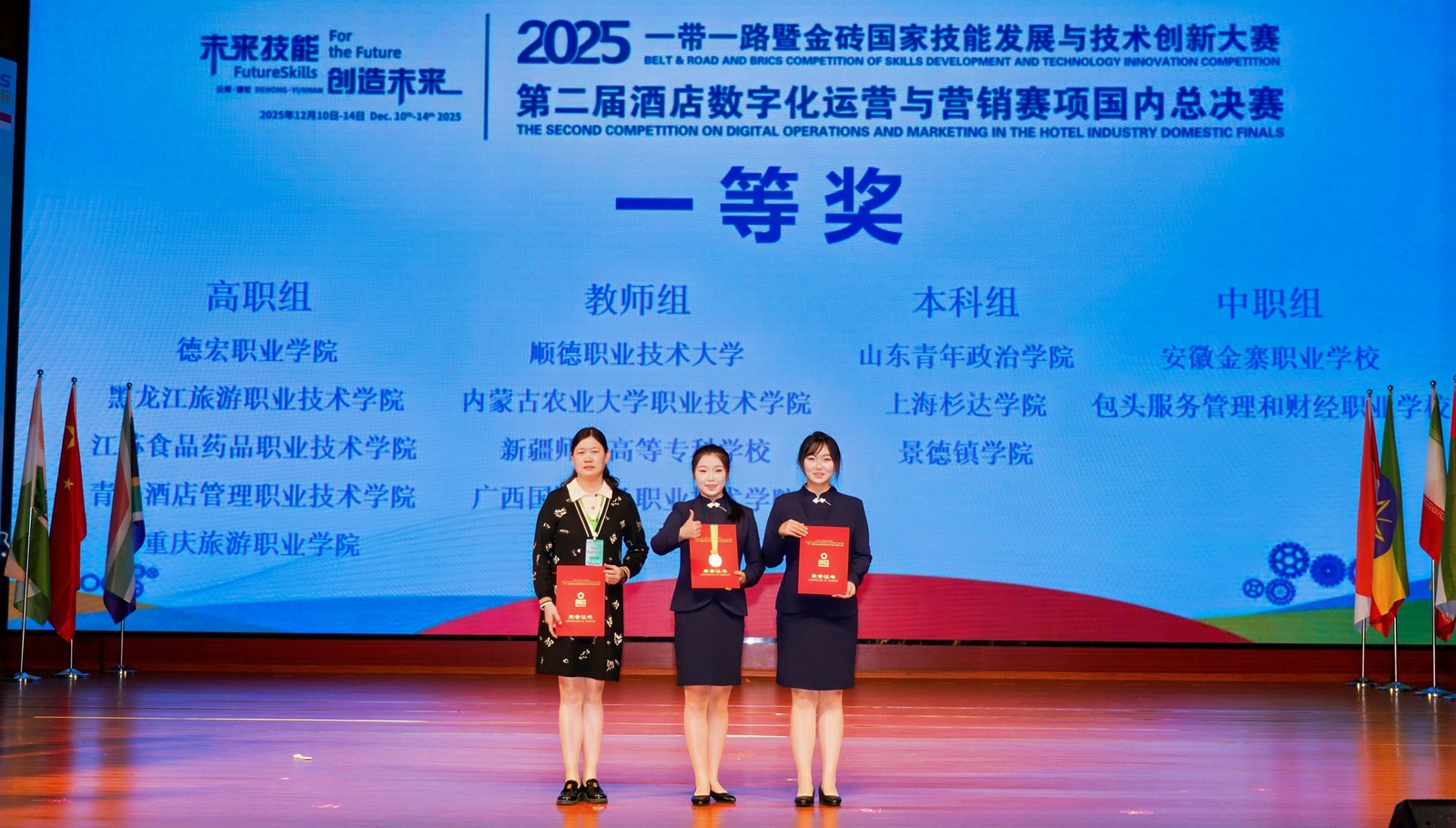 12月13日,2025年“一带一路”暨金砖国家技能发展与技术创新大赛第二届酒店数字化运营与营销赛项国内总决赛在云南省德宏州芒市德宏职业公司圆满落幕。该赛项要求选手完成酒店核心知识理论考核、酒店前厅接待数字技术应用、酒店运营数据基础分析与营销策划优化方案制作。公司w88win体育官网入口酒店232班李文静与西烹241班袁慈组成的员工代表队(指导老师:沈子杨,钱惠新),与来自全国本科、高职、中职及教师组等125支院校代表队,近500人同场角逐,最终斩获高职组一等奖。